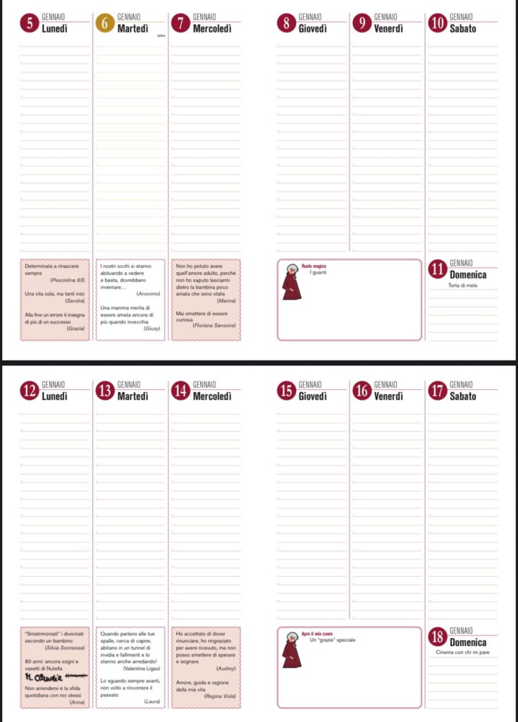 La nostra fantastica AGENDA 2026 è finalmente pronta!Non ho parole per descriverla, per spiegarvene la bellezza , per esprimervi la soddisfazione per averla realizzata con molti di voi. Un progetto che si è realizzato con la nostra collaborazione, una creatura nata dal lavoro mio e vostro !! Tante pagine scritte da me, altre vuote per le vostre riflessioni e gli appunti e poi l’interno normale di un’agenda.