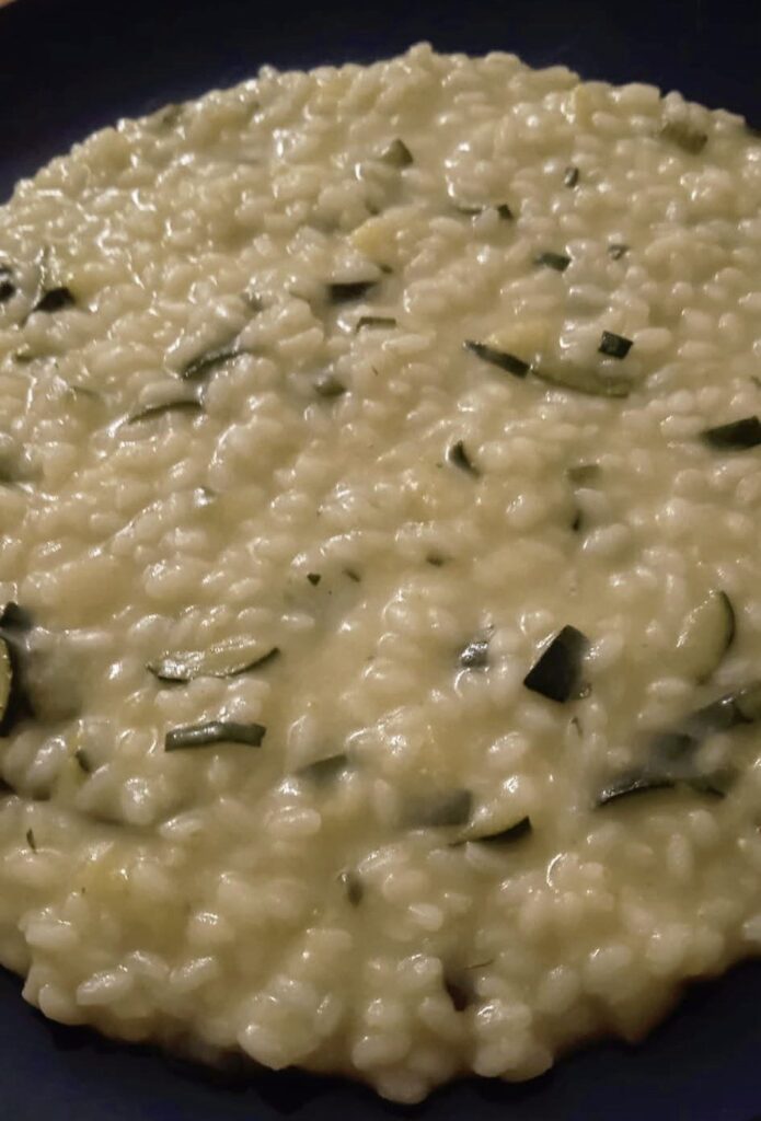 Cripto in risotto con zucchine verdi, scalogno e zenzero. Sfumato Sauvignon Blanc, portato a cottura con brodo di pollo. Mantecato con burro Valsassina e Grana Bella Lodi riserva bianca con latte di bufala. Un soffio di pepe bianco di Sarawak.